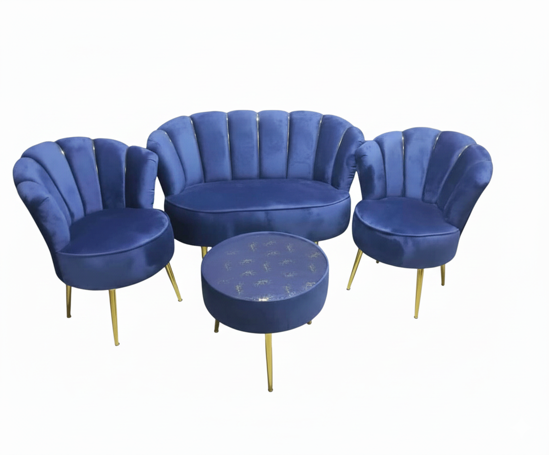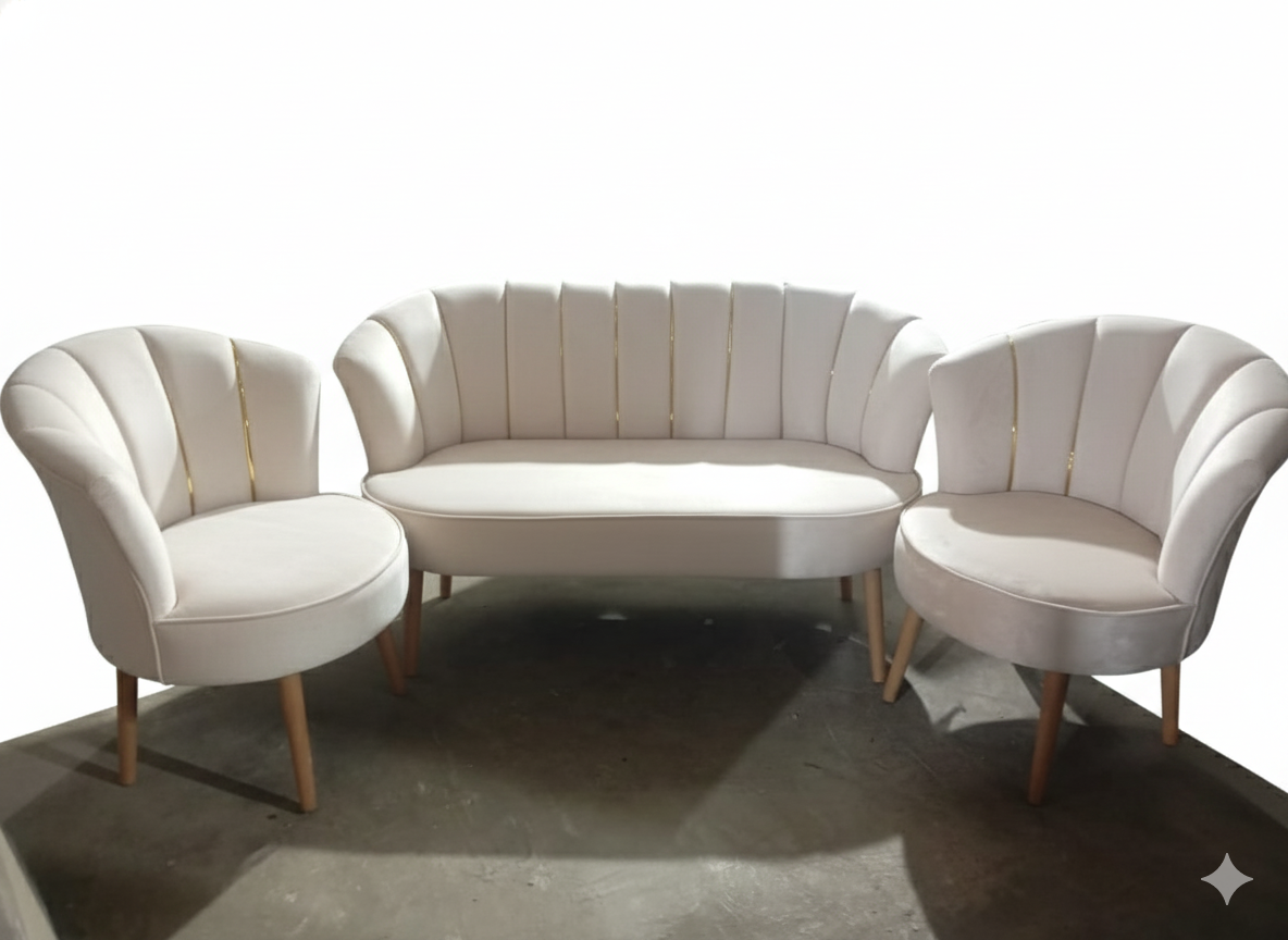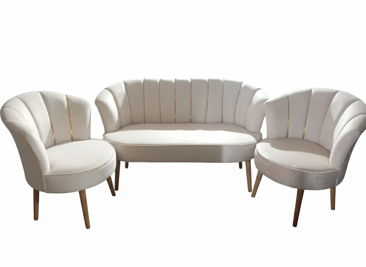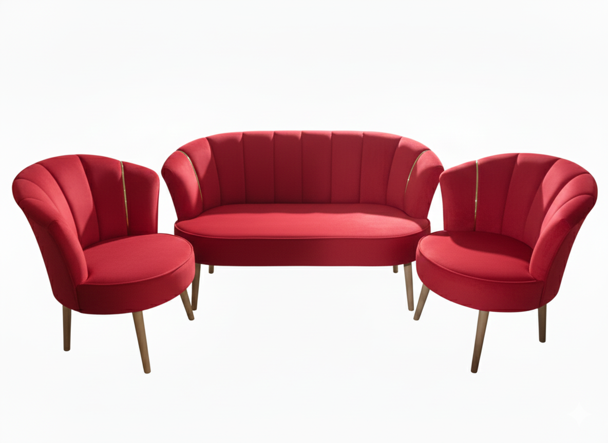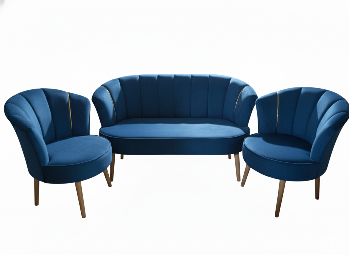 Cet ensemble de salon se distingue par son design Ă©lĂ©gant et contemporain, inspirĂ© du style Art DĂ©co. Il se compose d’un canapĂ© deux places et de deux fauteuils individuels, crĂ©ant une ambiance sophistiquĂ©e et accueillante.