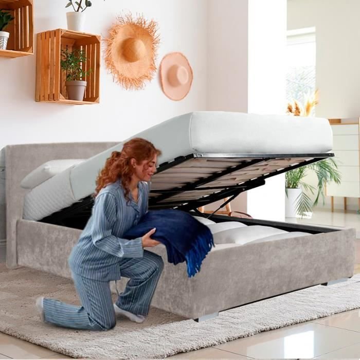 Lit coffre 160×200 avec sommier à lattes et vérins robustes. Rangement spacieux, tête de lit fonctionnelle et design moderne. Confort et durabilité garantis.